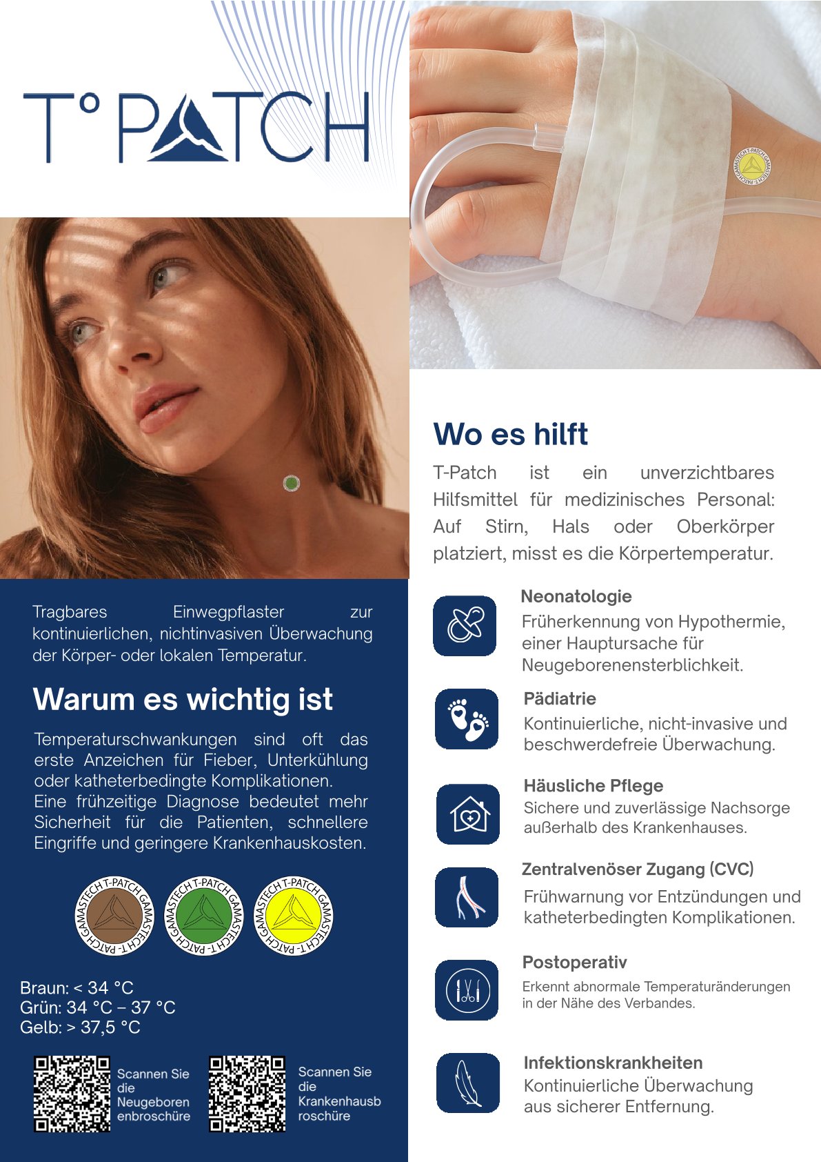 Pflaster, das für die kontinuierliche Überprüfung der lokalen Temperatur bzw. der Körpertemperatur konzipiert ist. Ermöglicht sofortige und konstante Überwachung der Körpertemperatur und erkennt die ersten Anzeichen von Fieber.